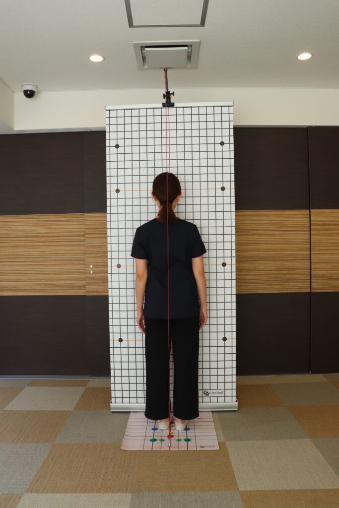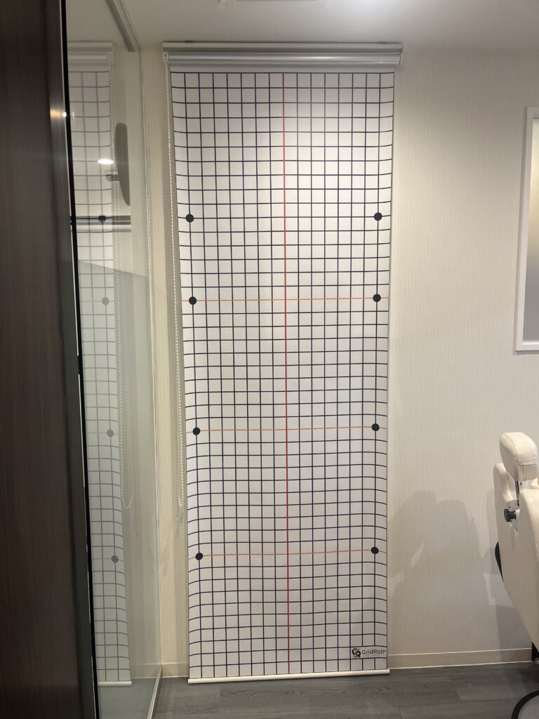 グリッドロールは、全身写真撮影時に使用するオリジナルの方眼スクリーンです。このスクリーンを利用することで、姿勢と動作のアンバランスを計測することが可能です。撮影の背景に方眼のスクリーンと垂直測定器を組み合わせることで、頭位の傾きや姿勢の左右対称性などが簡単に把握できます。
